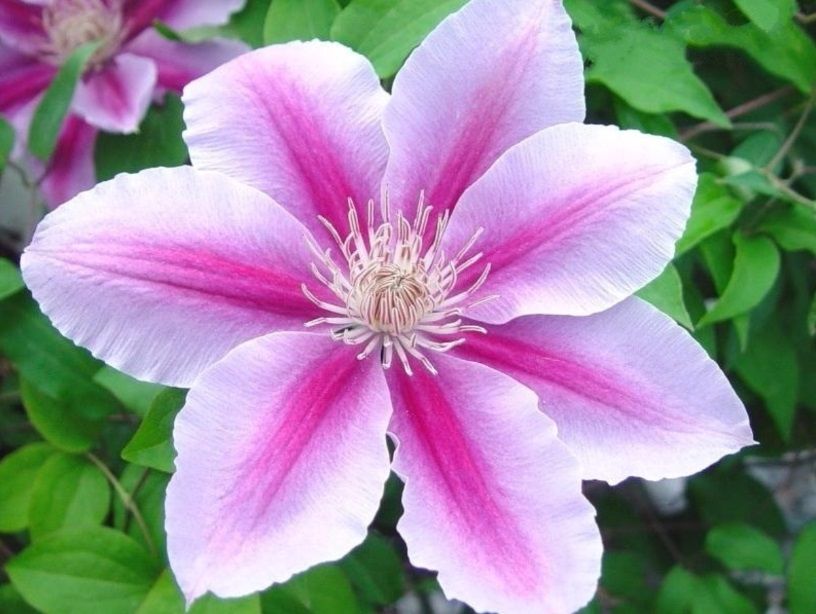 Клематис "Bees Jubilee" – это крупноцветковый сорт с розовыми цветками, украшенными темной полосой. Он цветет дважды в год: первый раз с мая по июнь на прошлогодних побегах, а второй раз – с августа до заморозков на побегах текущего года. Высота побегов достигает 2,5 метра, а ширина – до 1 метра. Диаметр цветков составляет около 16-18 см. Этот клематис идеально подходит для украшения дворов, дач, садов и приусадебных участков. Он отлично смотрится при вертикальном озеленении стен, специально изготовленных опор, решеток и штакетников, а также среди кустарников и полукустарников.