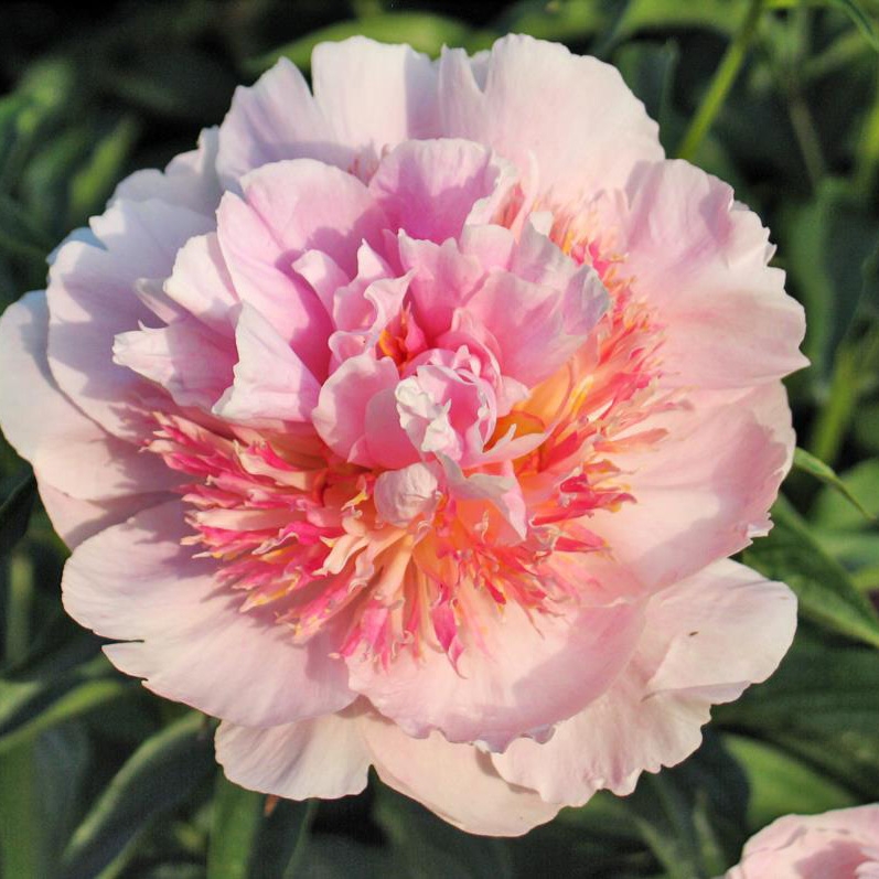 Сорт "Жемчужная Россыпь" представляет собой яркий пример махровых полушаровидных пионов. Этот травянистый, раскидистый пион выделяется своими крупными бутонами, достигающими до 14 см в диаметре, которые имеют оригинальную форму. Светло-розовые лепестки служат фоном для крупных видоизмененных тычинок с ярко-розовыми кончиками, создавая неповторимый визуальный эффект. Цветок имеет японскую форму и розово-перламутровый оттенок, с узкими стаминодиями, окрашенными в желтовато-розовый цвет с темно-розовыми краями. Аромат легкий и приятный. Куст многостебельный и раскидистый, достигает высоты 80 см. Стебли прочные и прямые, а листья мелкие и средне-зеленые. Цветение обильное и происходит в средние сроки.